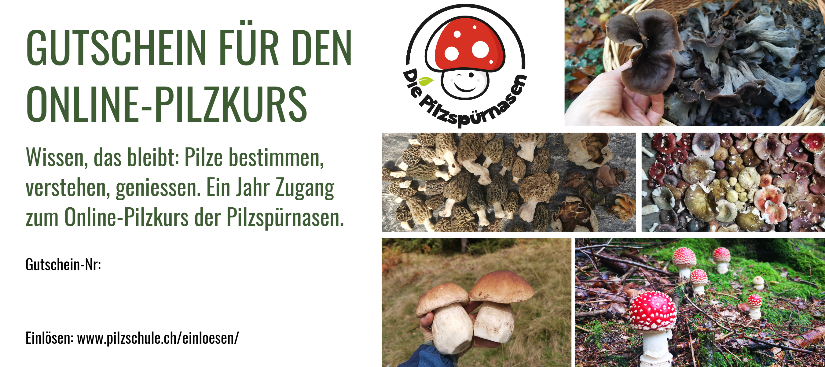 Gutschein für ein Jahres-Abo des Online-Pilzkurses. Preis Fr. 290.- 🌿 Klicke und bezahle hier.